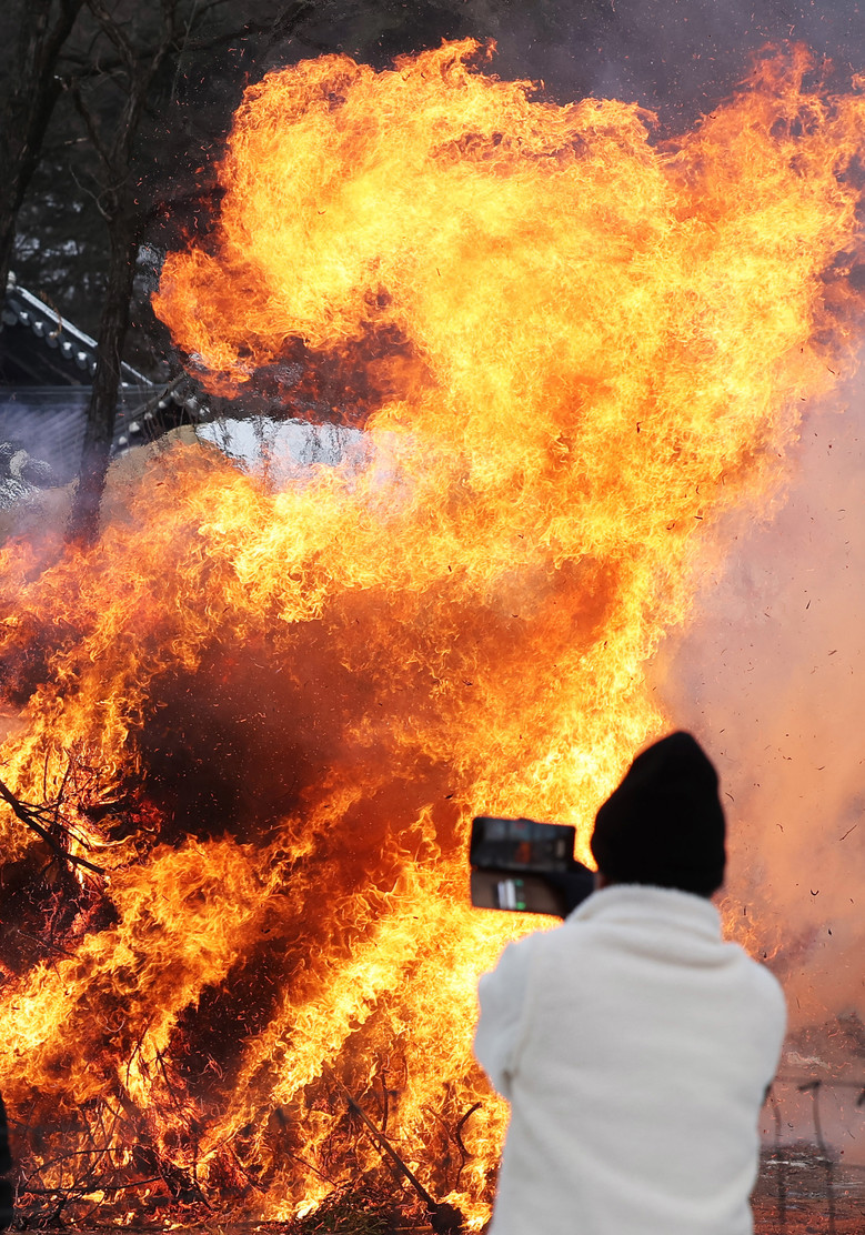 [세계타임즈 = 송민수 기자] 9일 오후 경기도 용인시 한국민속촌에서 열린 정월대보름 달집태우기 행사에서 시민들이 타오르는 달집을 사진에 남기고 있다. 2025.2.9