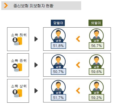 맞벌이 가정일수록 소득 상실에 대한 대비와 은퇴 후 삶에 대한 고민이 많을 것으로 예상되지만, 보험 가입현황을 보면 주 소득자가 한 명(주로 남편)에게 집중되어 있는 외벌이 가정이 그 필요성을 더 느끼는 것으로 해석된다.