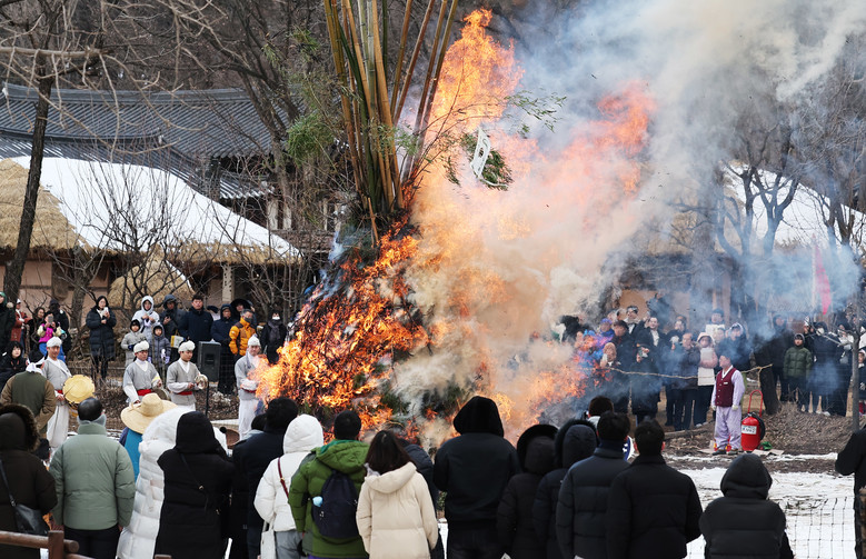 [세계타임즈 = 송민수 기자] 9일 오후 경기도 용인시 한국민속촌에서 열린 정월대보름 달집태우기 행사에서 시민들이 타오르는 달집을 바라보고 있다. 2025.2.9