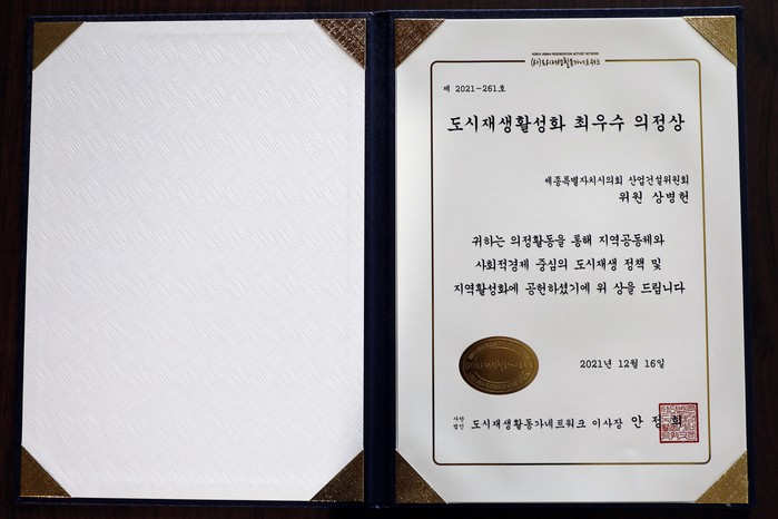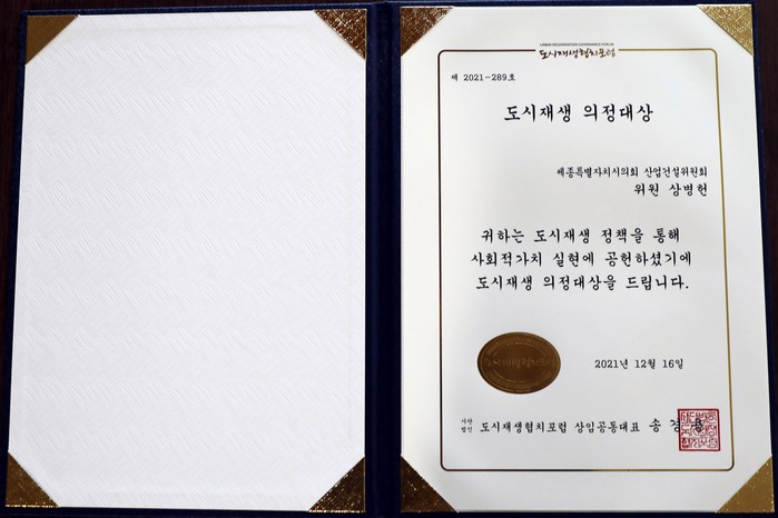 [세종=세계타임즈 이채봉 기자] 세종특별자치시의회 상병헌 의원(아름동)이 7일 도시재생협치포럼과 도시재생활동가네트워크로부터 ‘도시재생 의정대상’과 ‘도시재생 활성화 최우수 의정상’을 수상했다고 밝혔다.