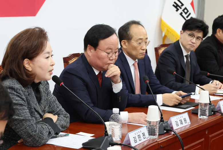 국민의힘 한동훈 대표(오른쪽)가 28일 오전 서울 여의도 국회에서 열린 최고위원회의에서 국민의힘 당원 게시판 논란과 관련해 발언하는 김민전 최고위원(왼쪽)을 바라보고 있다. 2024.11.28