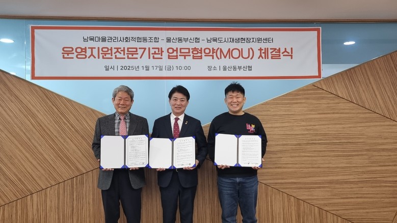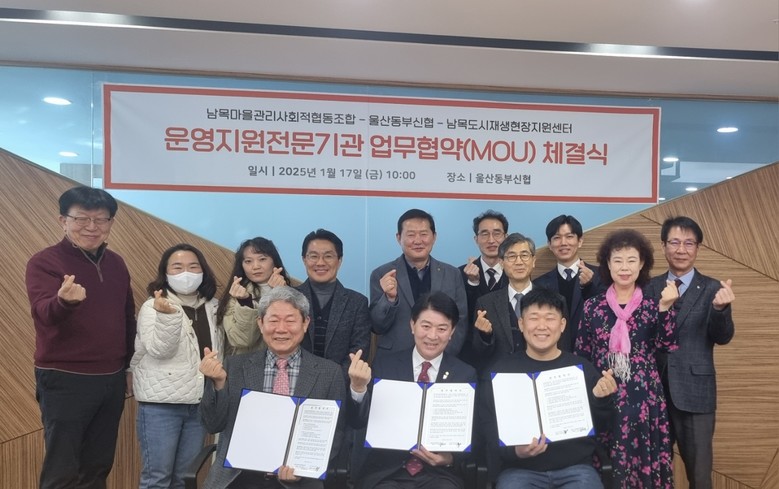 [동구 세계타임즈=이호근 기자] 남목마을관리사회적협동조합(이하 ‘남목마사협’)과 울산동부신협(이하 ‘동부신협’)은 1월 17일 오전 10시 동부신협에서 지속 가능한 도시재생과 주민 삶의 질 향상을 목표로 업무협약을 체결했다.