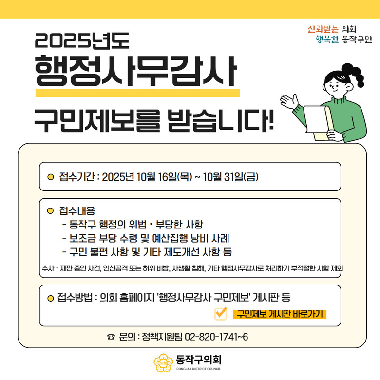 정재천 의장은 “구민 여러분의 소중한 제보가 더 나은 행정을 만드는 밑거름이 될 것”이라며 “동작구의회는 구민의 목소리를 충실히 반영해 내실 있는 행정사무감사가 이뤄지도록 최선을 다하겠다”고 전했다.