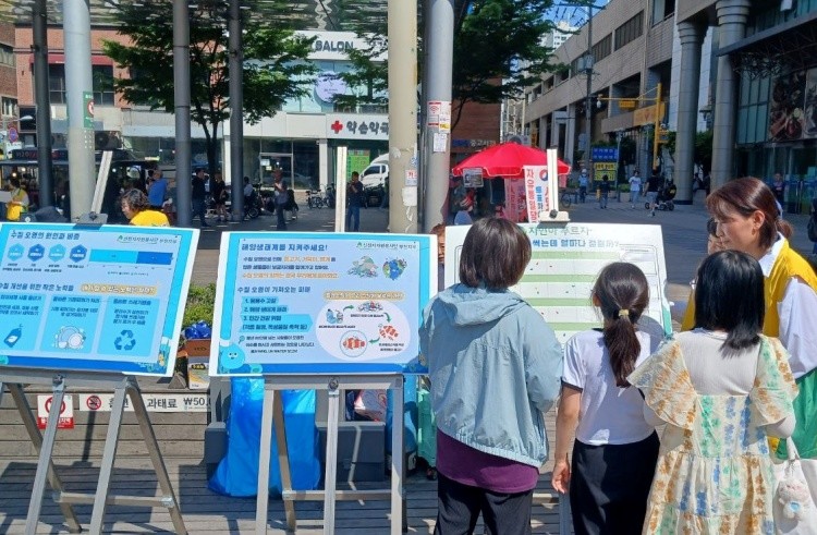 ▲지난 18일 부천 북부역 광장에서 신천지자원봉사단 부천지부가 ‘깨끗한 물 환경캠페인’을 진행했다.