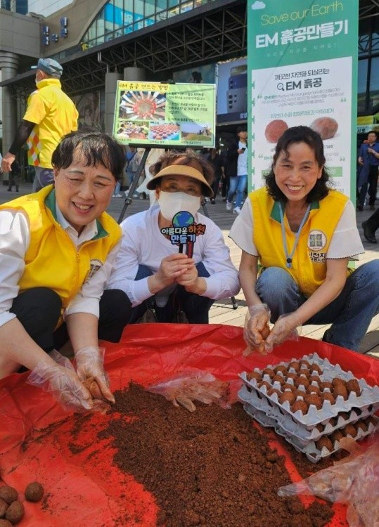 EM흙공은 EM(Effective Micro-organisms, 유용 미생물)용액을 흙에 섞어 빚은 공이다. EM흙공을 만들어 발효한 후 하천에 던지면 흙이 풀어지며 EM의 이로운 미생물들이 하천의 유기물을 발효 및 분해해 악취를 제거하고 깨끗한 수질로 복구시킨다.