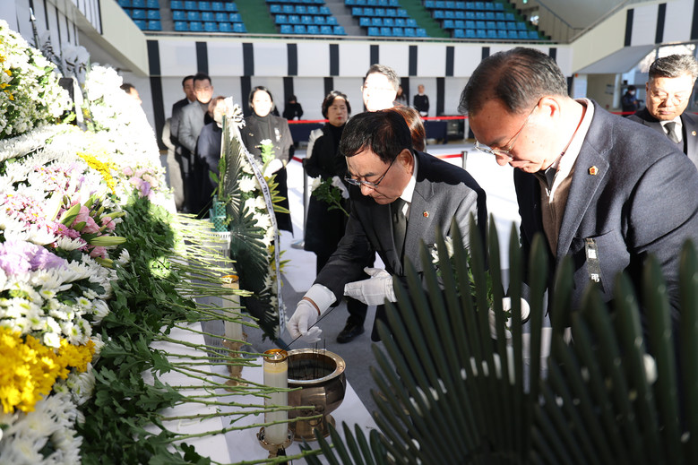 [대구 세계타임즈=한윤석 기자] 대구시의회 이만규 의장을 비롯한 시의원들은 12월 31일(화) 16:00 안병근올림픽기념유도관에 마련된 무안공항 사고 합동분향소에서 헌화와 묵념을 하면서 희생자들을 애도했다.