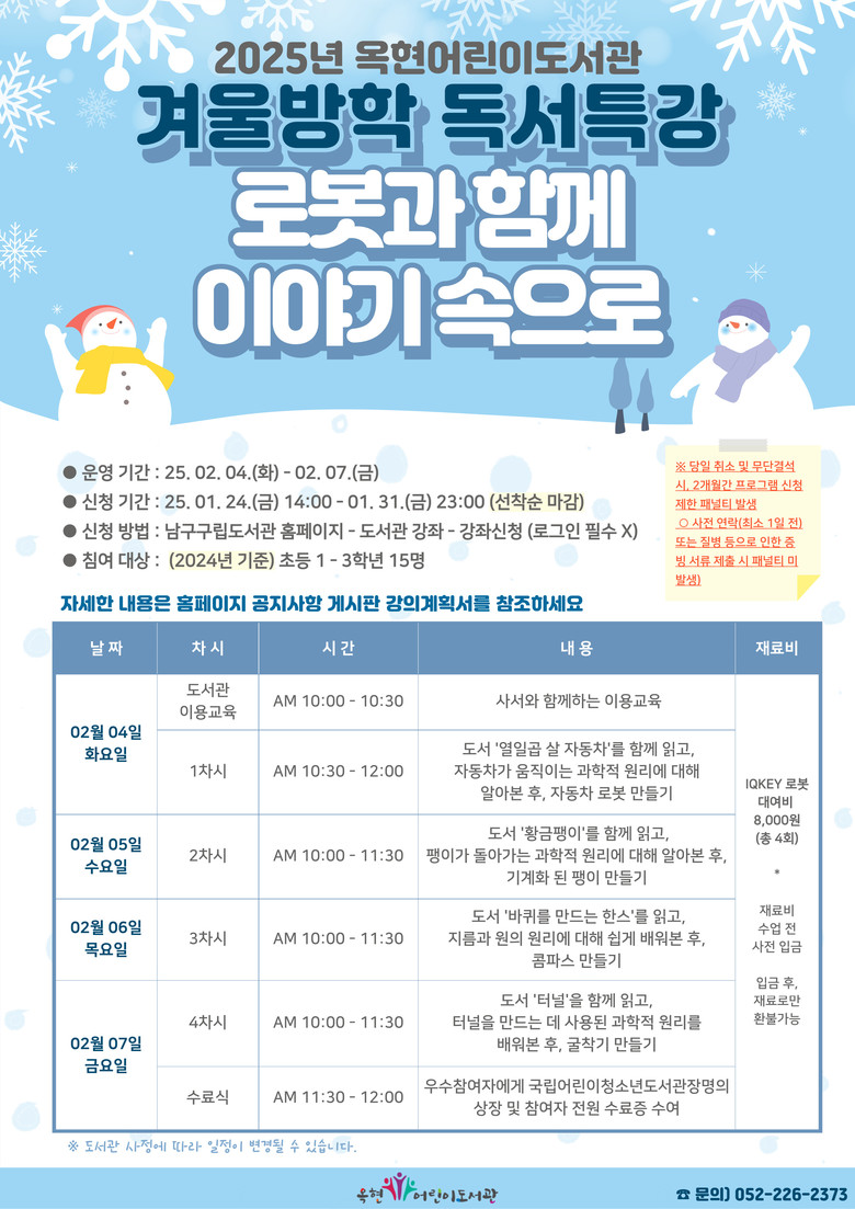 이번 행사는 국립어린이청소년도서관 ‘2025년 전국 도서관 겨울 독서교실’ 지원사업으로 독서교실 운영물품(독서노트, 스티커, 배지 등)을 지원받아 진행되며, 우수 참여자에게는 국립어린이청소년도서관장상도 수여한다.