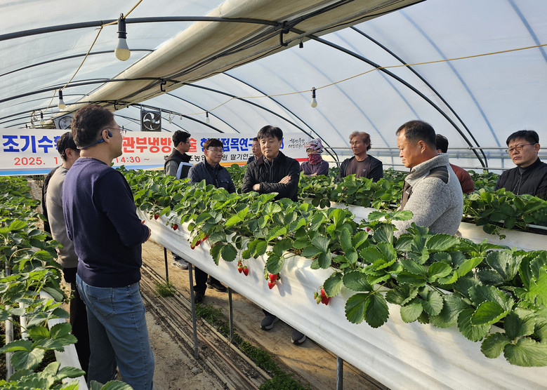 현장평가회에서는 딸기 재배농가, 연구 및 지도기관 관계자 등 200여 명이 참석한 가운데, 여름철 고온기에도 안정적으로 꽃눈분화를 유도할 수 있는 ‘조기정식 후 관부냉방 기술’의 적용성과 현장사례를 공유했다.