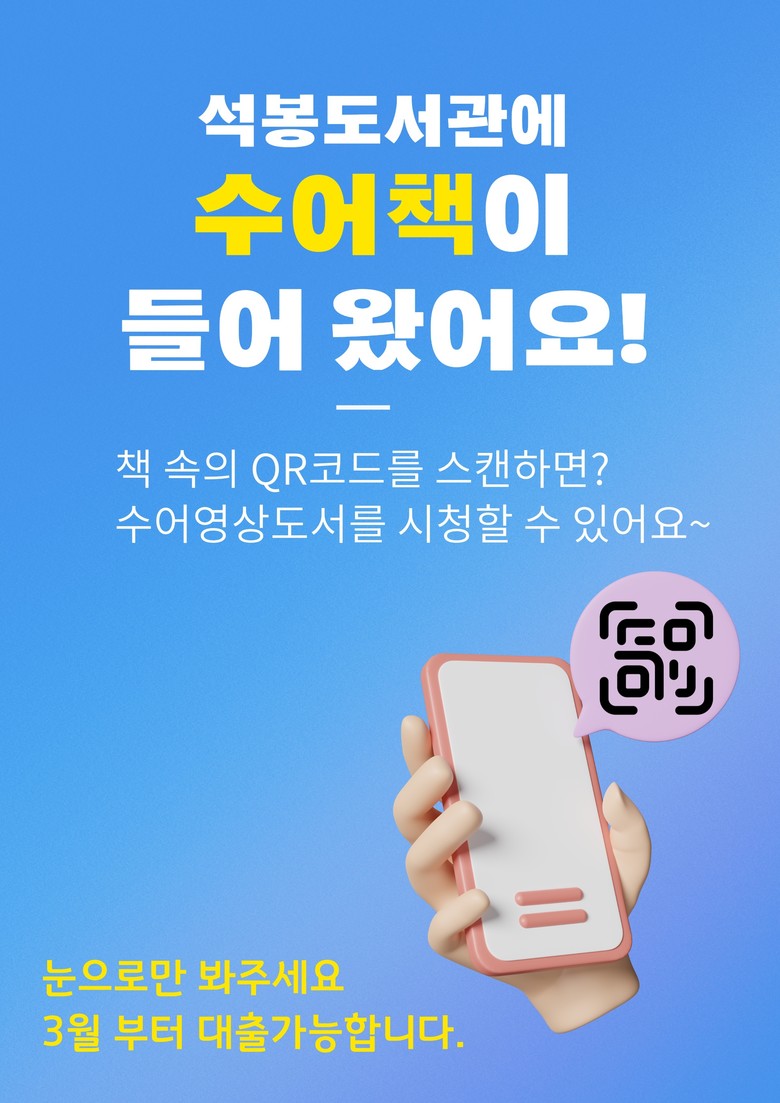 수어영상도서는 농인과 청각장애인의 제1언어인 한국수어로 도서 내용을 이해하기 쉽게 변환해 영상으로 제작한 자료다. 책에 부착된 QR코드를 휴대전화로 스캔하면 해당 내용의 수어 설명을 바로 확인할 수 있다.