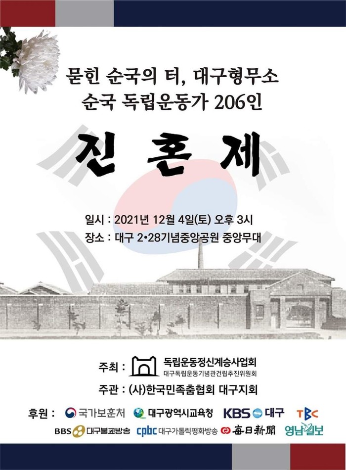 [대구=세계타임즈 한성국 기자] 대구광역시의회 교육위원회 이진련 의원은 12. 4.(토) 15시 독립운동정신계승사업회 주최로 2·28기념중앙공원에서 개최되는 ‘묻힌 순국의 터, 대구형무소 순국 독립운동가 206인 진혼제’ 행사에 집행위원 자격으로 참여하여 넋을 기린다.