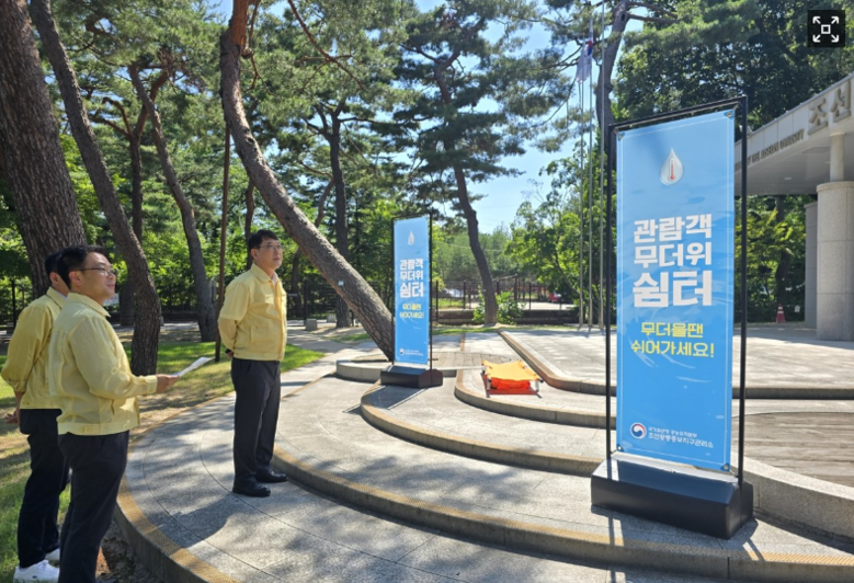 최응천 국가유산청장이 10일 서울 노원구 '태릉' 내 폭염에 대비하여 마련된 무더위 쉼터를 방문, 관계자들과 온열질환 대비상황을 점검하고 있다. 2025.7.10 [국가유산청 제공]
