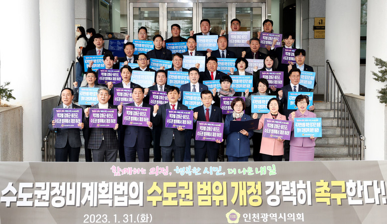 인천시의회(의장 허식)는 31일 시의회 본관 앞에서 허식 의장을 비롯해 시의원 40명 전원이 참석한 가운데 ‘수도권정비계획법’의 수도권 범위개정 촉구 결의대회를 개최했다.