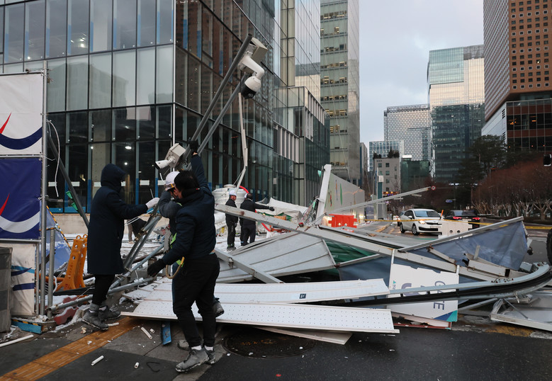 강풍에 쓰러진 공사장 펜스