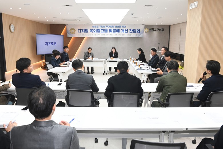 [영등포구 세계타임즈=이장성 기자] 영등포구의회 양송이 행정위원장과 신흥식 의원은 지난 7일 오후 5시, 영등포구의회 3층 다목적회의실에서 올림픽대로변 대형 디지털 옥외광고물로 인해 지속적인 빛공해 피해를 호소하는 주민들과 관계 기관이 함께하는 ‘디지털 옥외광고물 빛공해 개선 간담회’를 개최하였다.