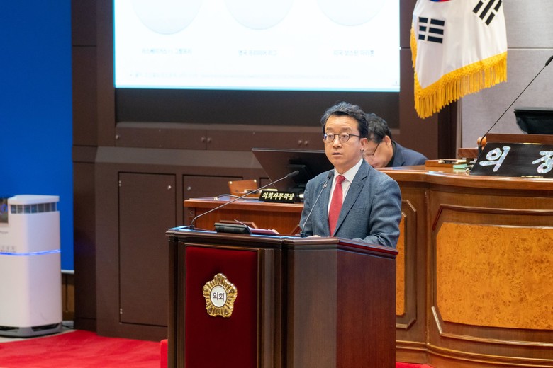 | ▲ 강남구의회 윤석민 의원이 제329회 임시회(제1차 본회의)에서 5분 자유발언을 하고 있다. |