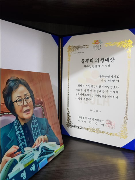 [대구=세계타임즈 한성국 기자] 대구광역시의회 이영애 의원(문화복지위원회, 달서구 1)이 지난 8일 ‘사단법인 지방자치발전소'(이사장 김승애)에서 선정하는 ‘2021 전국지방의원 풀뿌리 의정대상’ 우수입법분야에서 우수상 수상자로 선정되었다.