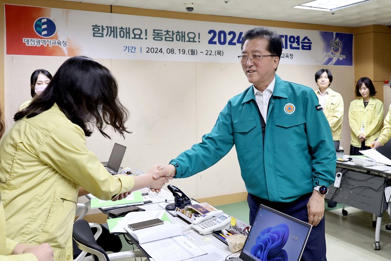 [대전 세계타임즈=이채봉 기자] 대전시의회 조원휘 의장을 비롯한 의장단 및 상임위원장단은 20일 2024년 을지연습이 진행중인 대전시청과 교육청 2개 기관 상황실을 방문해 비상 대비 태세를 점검하고 위문품을 전달했다.
