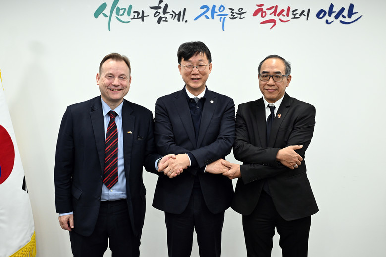 | ▲ 이민근 안산시장(사진 가운데)이 4일 게오르크 슈미트 주한독일대사(왼쪽)와 타니 생랏 주한태국대사(오른쪽)과 손을 맞잡으며 기념 촬영을 하고 있다. |