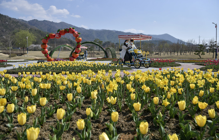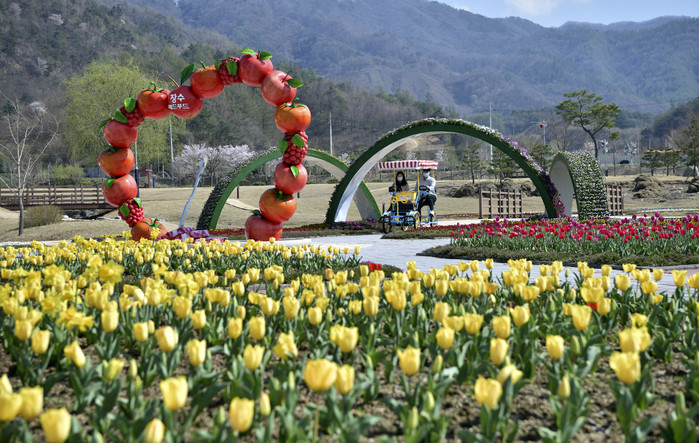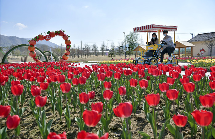 장수군 누리파크를 찾은 사람들이 튤립이 만개한 경관단지에서 커플자전거를 즐기고 있다.