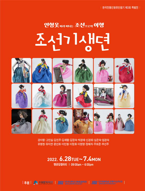 [세계타임즈 이현영 기자] 단국대학교 평생교육원 한국전통인형옷만들기반이 수원 행궁길갤러리에서 ‘인형옷 따라 떠나는 조선으로의 여행, 조선기생뎐’을 주제로 6월 28일부터 7월 4일까지 일주일간 특별전시를 진행해 성황리에 종료됐다.