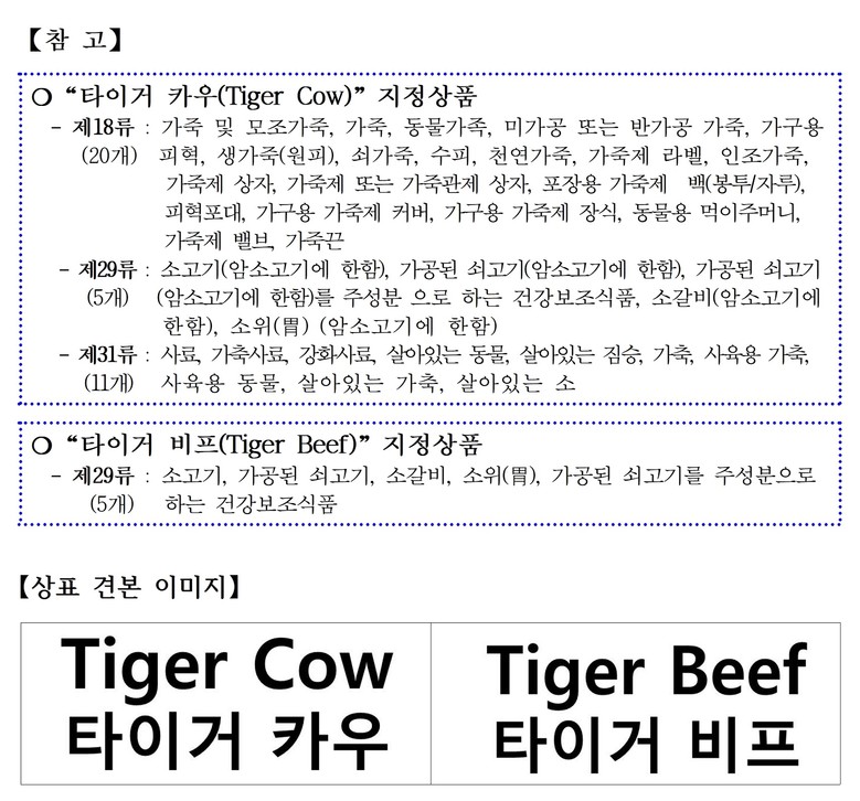 등록된 상표 ‘타이거 카우(Tiger Cow)’는 고성군 자생 칡소의 독특한 외형과 가치를 반영한 브랜드로, 소고기, 가죽 등 대표 상품(제18류, 29류, 31류 / 36개 품목)에 적용된다. 또한 ‘타이거 비프(Tiger Beef)’는 칡소 육류 및 가공제품(제29류 / 5개 품목)을 대표하는 브랜드로서 등록되어, 고성칡소 산업의 경쟁력 강화에 기여할 것으로 기대된다.