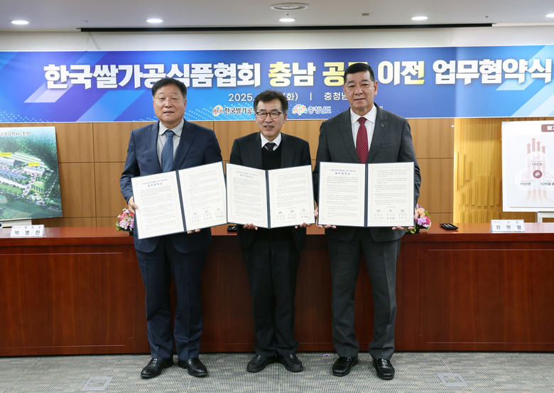 도는 2일 도청 상황실에서 김태흠 지사와 박병찬 한국쌀가공식품협회장, 최원철 공주시장이 ‘한국쌀가공식품협회 청사 이전을 위한 업무협약’을 체결했다고 밝혔다.
