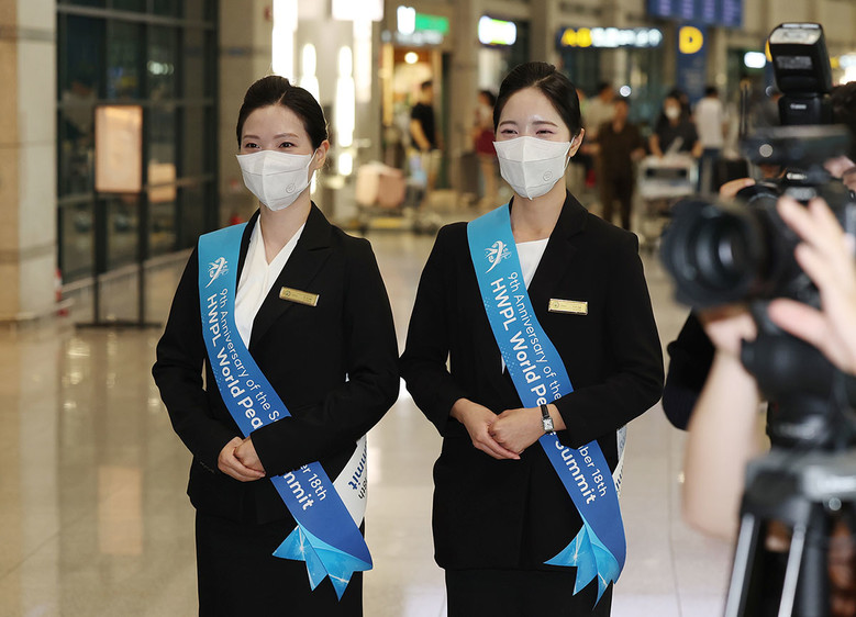 ▲16일 오전 인천국제공항에서 HWPL 공항의전 봉사자들이 인사에게 걸어줄 화환을 들고 있다.
