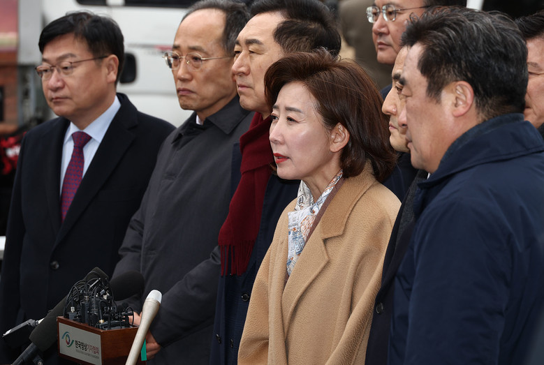 국민의힘 나경원 의원을 비롯한 국민의힘 의원들이 전날 서울 종로구 헌법재판소에서 열린 윤석열 대통령 탄핵 심판 11차 변론 방청에 앞서 입장을 밝히고 있다. 2025.2.25 [사진공동취재단]