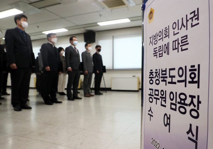 [충북=세계타임즈 이현진 기자] 개정 지방자치법 시행 첫날인 13일 충북도의회가 지방의회 인사권 독립에 따른 공무원 임용장 수여식을 진행하고 있다./충북도의회 제공