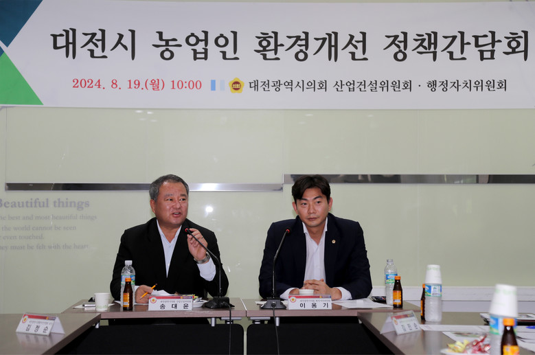 [대전 세계타임즈=이채봉 기자] 대전시의회 송대윤 의원(더불어민주당, 유성구 제2선거구)과 이용기 의원(국민의힘, 대덕구 제3선거구)은 19일 농업기술센터에서 농업인의 경영환경 개선을 위한 정책간담회를 개최했다.
