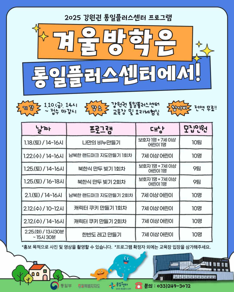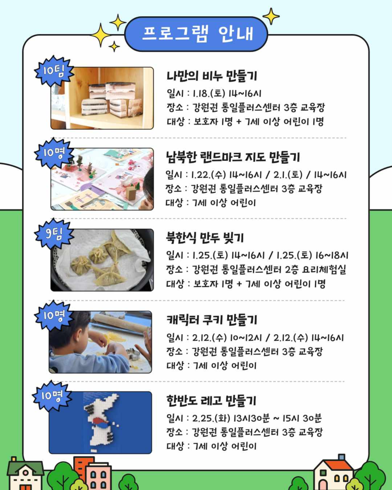 참여 프로그램의 자세한 내용은 강원권 통일플러스센터 홈페이지 및 SNS를 통해 확인할 수 있으며, 신청은 1월 10일 오후 2시부터 시작된다.