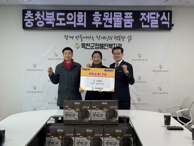 [충북 세계타임즈=이현진 기자] 충북도의회 유재목 부의장(옥천1)과 박용규 의회운영위원장(옥천2)은 11일 설 명절을 맞아 옥천군장애인복지관을 방문해 후원 물품 전달식을 갖고 시설 종사자들을 격려하며 따뜻한 명절의 정을 나눴다.