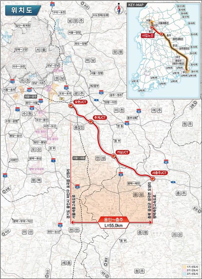 ‘용인~충주 고속도로’는 용인시 처인구 모현분기점(서울~세종)에서 음성군 생극면 서충주 분기점(평택~제천)까지 직접 연결하여 4차로(55㎞)를 신설하는 사업이다.