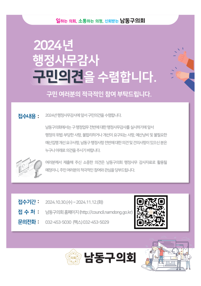‘행정사무감사’는 의회의 집행부 감시권의 하나로, 남동구의회는 11월 개최 예정인 제300회 제2차 정례회에서 남동구에 대한 행정사무감사를 실시할 예정이다. 이에 앞서 구의회는 구민들로부터 다양한 제보와 의견을 접수받아 이번 행정사무감사에 반영하고자 한다.