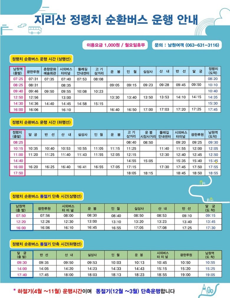 한편, 정령치 순환버스의 상세 노선과 시간표 등 자세한 사항은 남원시 홈페이지에서 확인할 수 있다.