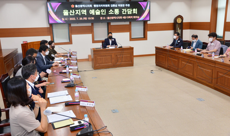 [울산 세계타임즈=이호근 기자] 울산광역시의회 김종섭 행정자치위원장은 28일 오전 10시 30분 시의회 4층 다목적회의실에서 울산예총 회장, 울산문인협회, 울산미술협회, 시 관계자 등 15명과 ‘울산지역 문화예술인 소통 간담회’를 가졌다.