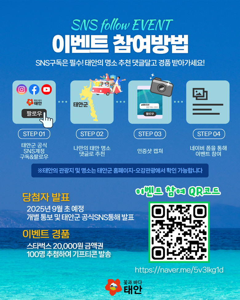 군은 7월 30일부터 8월 31일까지 약 한 달간 태안군 공식 SNS(인스타그램, 페이스북, 유튜브)에서 ‘태안군 구독 및 댓글 이벤트’를 열고 참여자 중 100명을 추첨해 각 2만 원 상당의 스타벅스 커피 기프티콘을 제공할 예정이라고 밝혔다.