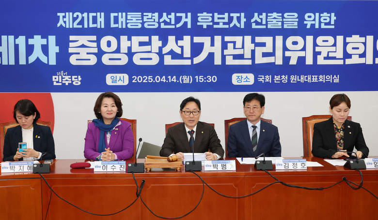 더불어민주당 박범계 중앙선거관리위원장이 14일 서울 여의도 국회에서 선관위 1차 회의를 주재하고 있다. 2025.4.14