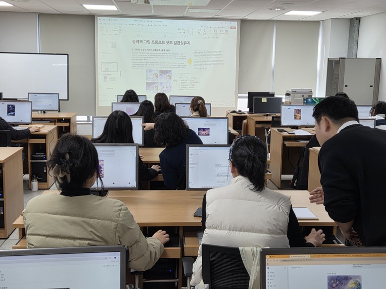 1차 연수에서는 ▲생성형 AI 개념 이해 ▲프롬프트 설계 방법 ▲챗GPT를 활용한 동화책 제작 ▲제미나이(Gemini)를 활용한 이미지 생성 및 콘텐츠 제작 등 AI 기반 교육자료 제작 실습이 이루어졌다. 참여자들은 직접 AI 도구를 활용해 독서활동과 연계한 교육콘텐츠를 제작해 보며, 학교 현장에서 활용 가능한 창의적 교육자료 개발 가능성을 확인하는 시간을 가졌다.
