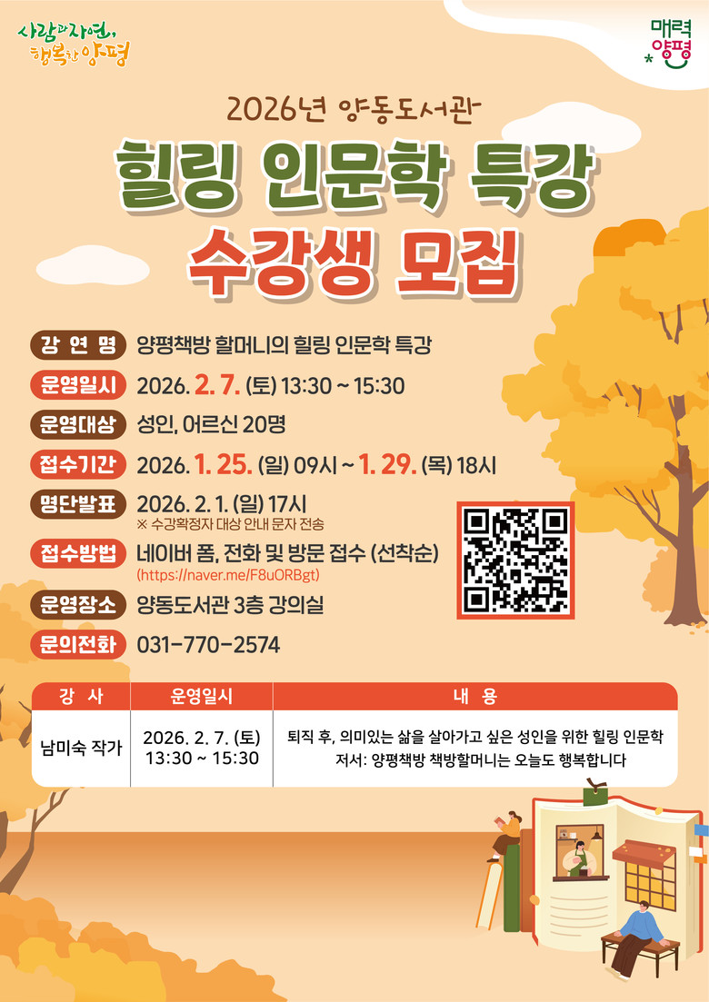 한편, 자세한 사항은 양평군도서관 누리집을 참고하거나 양동도서관(☎ 031-770-2574)으로 문의하면 된다.