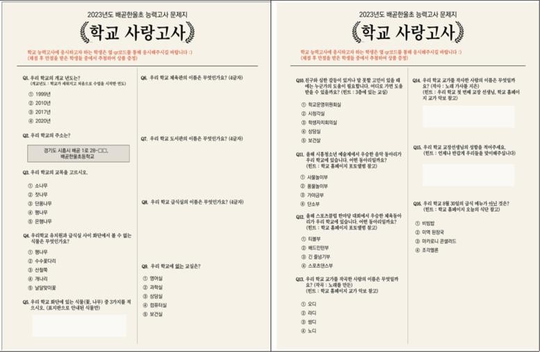 먼저 학교사랑주간‘배곧한울 학교사랑고사’는 본교 배곧한울초와 관련된 문제들을 모아서, 학교에 대해 좀 더 알아보는 시간을 가지기 위한 목적을 가지고 활동하였다. 학생들은 본교 학교사랑고사 사이트에 접속하여 우리학교와 관련된 총 16개의 문제를 해결 하였다.