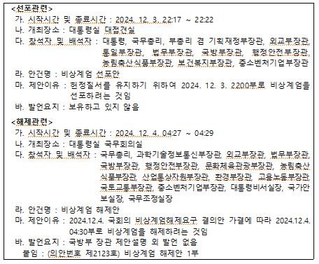 [세계타임즈 = 이채봉 기자] 대통령실이 비상계엄 선포와 관련된 국무회의 당시 참석자들의 발언요지를 보유하고 있지 않다고 밝혔다.행정안전부는 비상계엄 선포 및 해제와 관련해 대통령비서실에 요청한 자료를 회신받았다며 대통령실의 회신 내용을 공개했다.행안부가 공개한 대통령실 회신 내용에 따르면 비상계엄 선포 관련 회의는 지난 3일 오후 10시 17분에서 22분까지 5분간 대통령실 대접견실에서 열렸다.안건명은 비상계엄 선포안으로, 안건 제안 이유는 헌정질서를 유지하기 위해 3일 오후 10시부로 비상계엄을 선포하려는 것이었다고 대통령실은 밝혔다.다만 발언요지와 관련해 대통령실은 보유하고 있지 않다고 설명했다.행안부는 이와 관련해 회신자료에 안건명만 있고 안건자료는 없다고 부연했다.비상계엄을 선포하기 위한 국무회의 시간, 장소, 참석자, 안건명, 제안이유는 적시되어 있지만 정작 대통령을 비롯한 국무위원들의 회의 발언록을 보유하고 있지 않다는 것으로, 부실 회의록이라는 지적이 나온다.이 회의에 참석 및 배석한 사람은 윤석열 대통령과 한덕수 국무총리, 최상목 부총리 겸 기획재정부 장관, 조태열 외교부 장관, 김영호 통일부 장관, 박성재 법무부 장관, 김용현 국방부 장관, 이상민 행안부 장관, 송미령 농림축산식품부 장관, 조규홍 보건복지부 장관, 오영주 중소벤처기업부 장관 등 11명이었다.해제 관련 국무회의는 대통령실 국무회의실에서 다음날인 4일 오전 4시 27분에서 29분까지 단 2분간 열렸다.이 회의에 윤 대통령은 불참했다.한 총리를 비롯해 계엄 선포 관련 회의 자리에 있었던 외교장관, 법무장관, 국방장관, 행안장관, 농식품장관, 중기장관 등 7명이 참석했다.여기에 유상임 과학기술정보통신부 장관, 유인촌 문화체육관광부 장관, 안덕근 산업통상자원부 장관, 김완섭 환경부 장관, 김문수 고용노동부 장관, 박상우 국토교통부 장관, 정진석 대통령 비서실장, 신원식 국가안보실장, 방기선 국무조정실장 등 계엄 선포 관련 회의 자리에 없었던 9명 등 총 16명이 계엄 해제를 위한 회의에 함께 했다.