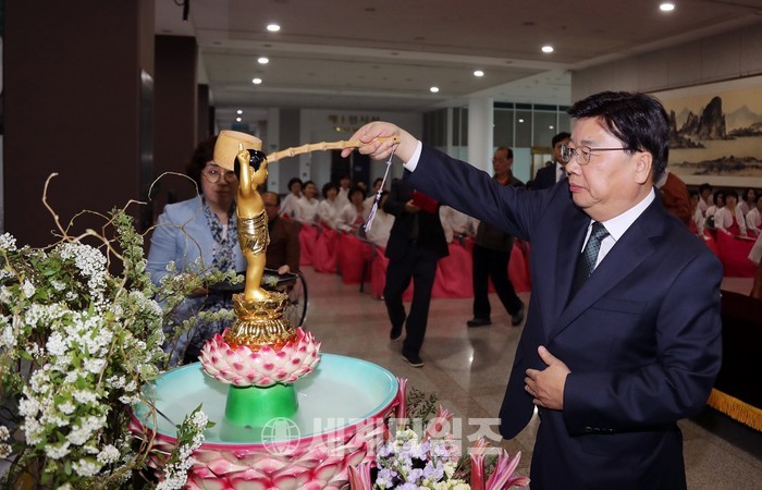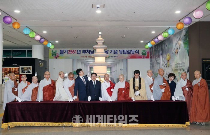 [대전=세계타임즈 이장성 기자] 대전광역시(시장 권선택)는 불기 2561년 부처님 오신 날을 축하하고, 시정과 시민의 안녕을 기원하기 위하여 권선택 대전시장, 김경훈 대전시 의회 의장, 초청인사, 불자회원들이 참석한 가운데 25일 대전시청 1층 로비에서 등탑 점등식을 가졌다.