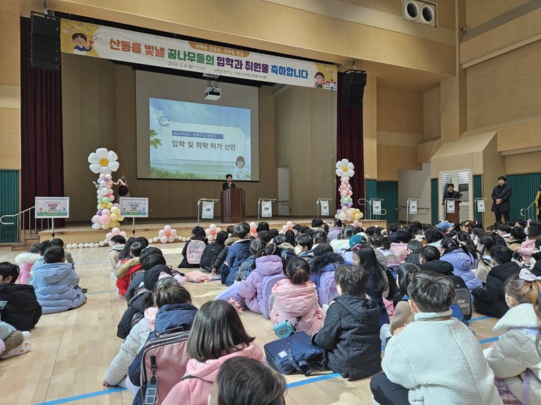 [아산시 세계타임즈=백택기 기자] 산동초등학교병설유치원(원장 김선중)은 2024년 3월 4일(월) 본교 강당에서 초등학교 1학년 신입생 127명과 병설유치원 유아 44명의 입학식을 실시하였다.