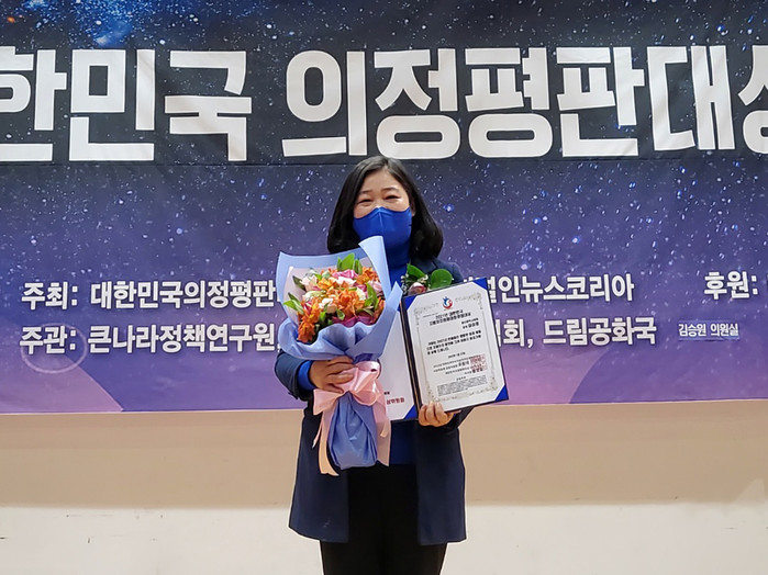 [울산=세계타임즈 이호근 기자] 울산광역시의회 이미영 의원(행정자치위원)이 27일 국회 의원회관 대회의실에서 열린 “2021년 대한민국의정평판대상” 시상식에서 “지방자치의원 의정대상”을 수상했다.