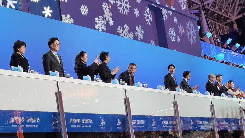 우원식 의장이 시진핑 국가주석 등 각국 정상들과 함께 하얼빈 동계아시안게임 개막식을 관람하고 있다.