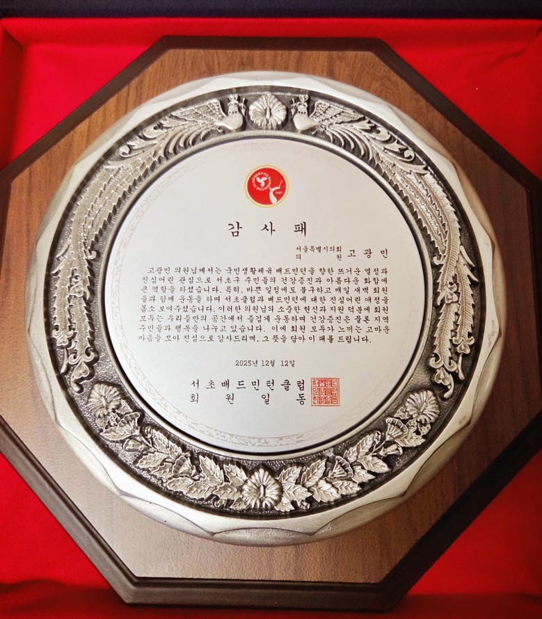 [서울 세계타임즈=이장성 기자] 서울특별시의회 고광민 의원(국민의힘, 서초3)은 지난 12일 서초구 주민들의 건강 증진과 생활체육 활성화에 기여한 공로를 인정받아 서초배드민턴클럽으로부터 감사패를 받았다.
