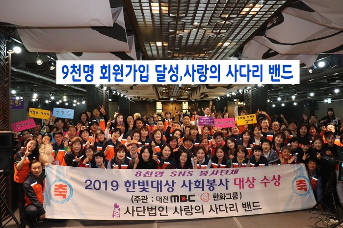 [대전=세계타임즈 이채봉 기자] 다양한 봉사를 꾸준히 실천하고 있는 대전시 SNS 봉사단체 사랑의 사다리 밴드(리더 이정제)가 지난 21일 오후2시, 9천명 회원가입 달성이라는 경이적인 기록을 세우면서 지역봉사의 새 역사를 써나가고 있다.