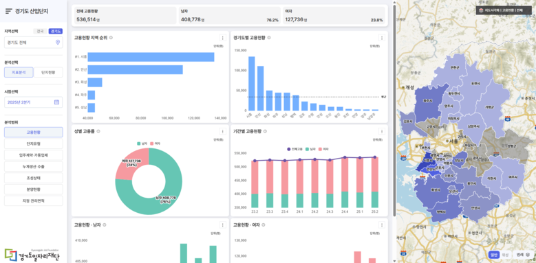 ‘경기도일자리상황판’은 고용, 산업, 경제, 인구 등 다양한 분야의 데이터를 통합해 지역별 일자리와 경제 흐름 변화를 종합적으로 분석할 수 있도록 구축된 데이터 기반 정책 지원 플랫폼이다. 특히 정책 담당자가 주요 지표 변화를 직관적으로 이해하고 신속한 의사결정을 내릴 수 있도록 지원하는 데 초점을 맞췄다.