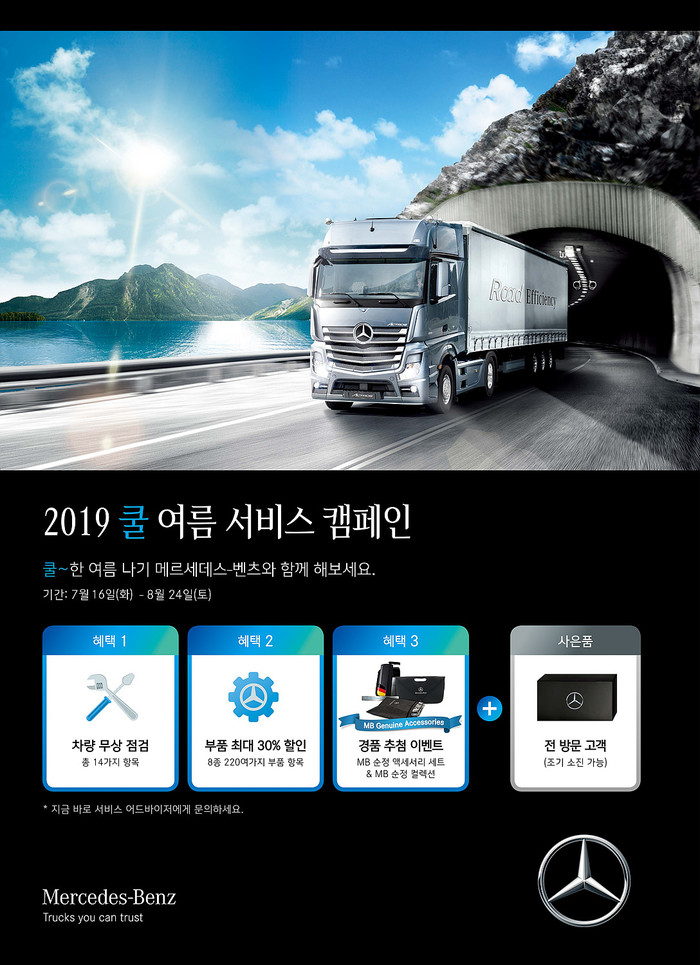 [세계타임즈 이영진 기자] 다임러 트럭 코리아(주)가 메르세데스-벤츠 트럭 고객들을 대상으로 7월 16일(화)부터 8월 24일(토)까지 총 6주동안 전국 메르세데스-벤츠 상용차 공식 서비스센터에서 ‘2019 쿨 여름 서비스 캠페인’을 실시한다.